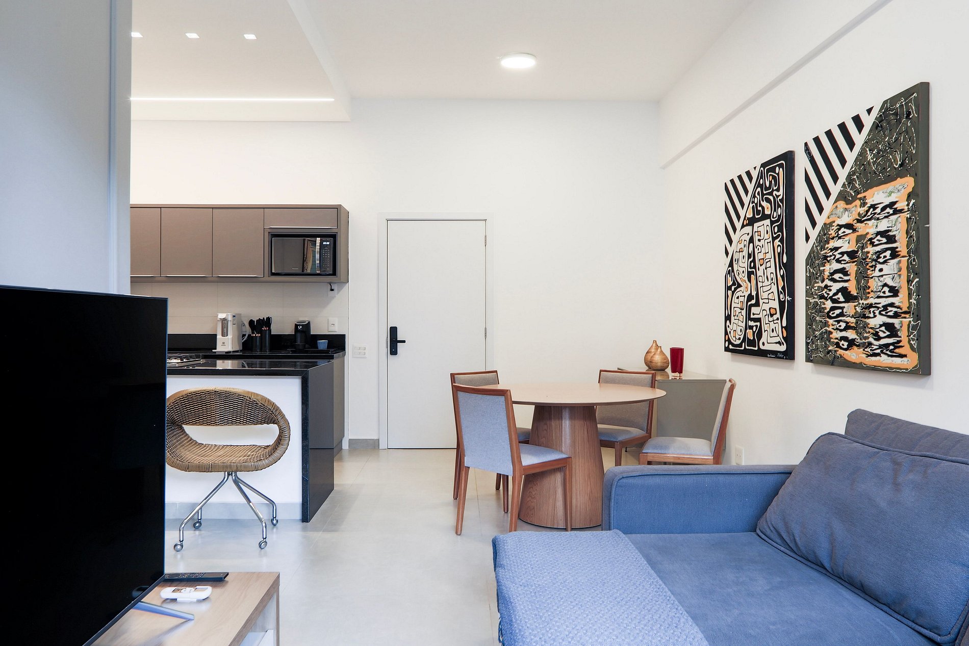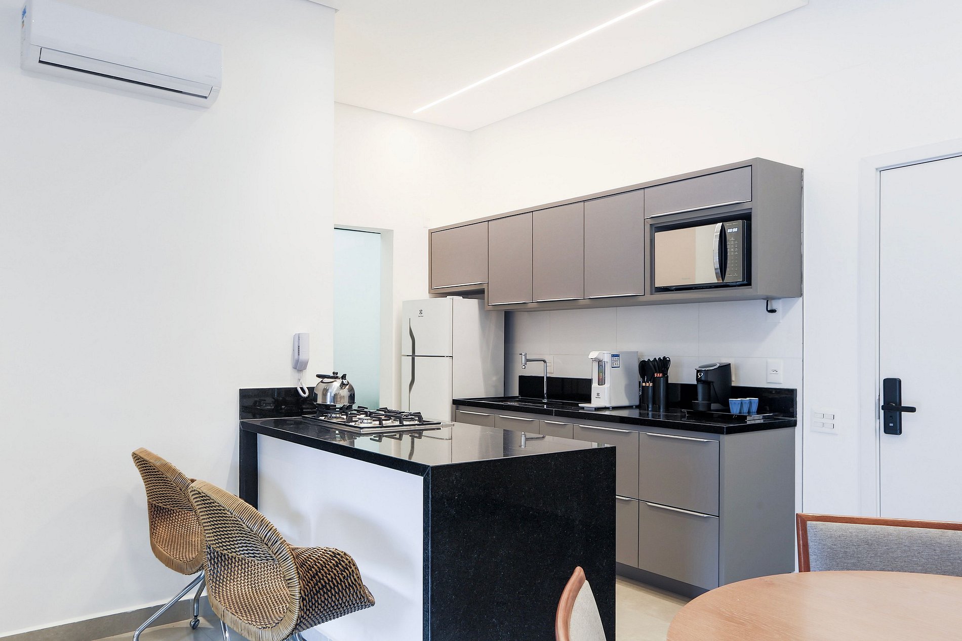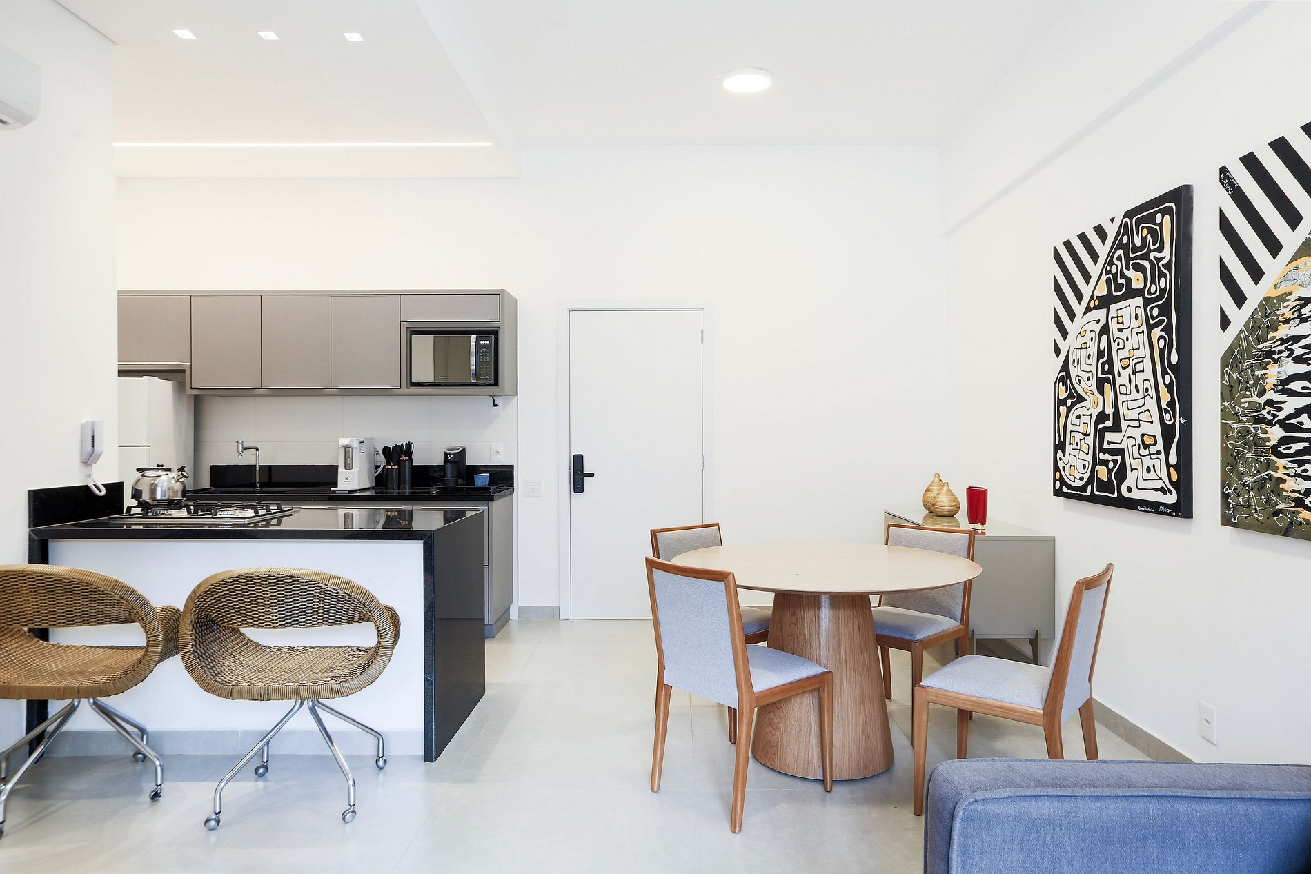 O espaço conta com dois quartos (sendo uma suíte), ar-condicionado, Wi-Fi de alta velocidade e uma cozinha totalmente equipada — ideal para estadias de trabalho ou lazer.